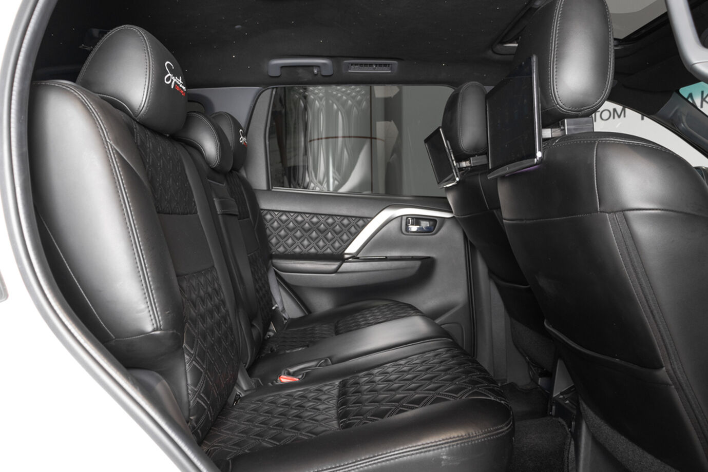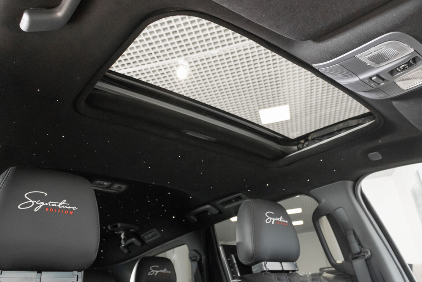 •Комплектация Signature Edition из ОАЭ, включает в себя потолок звездное небо, мониторы на подголовниках передних сидений, яркая стилистика черный верх белый низ, так же установлены обвесы и измененная решетка радиатора, перешитый салон и прочие доработки